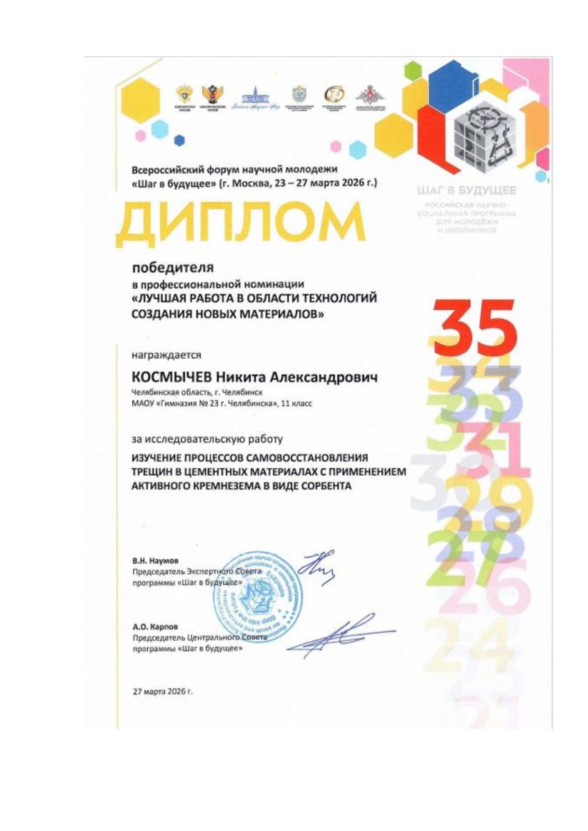 На секции «ТЕХНОЛОГИИ СОЗДАНИЯ НОВЫХ МАТЕРИАЛОВ» Никита представил исследование на тему: «Изучение процессов самовосстановления трещин в цементных материалах с применением активного кремнезема в виде сорбента».